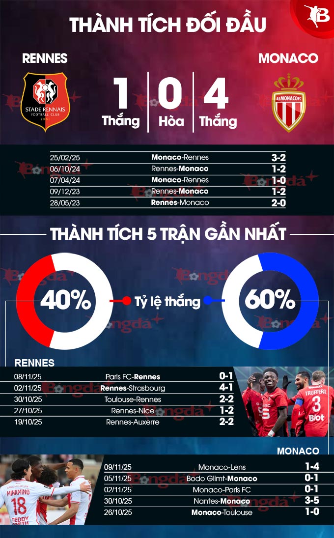 Ngoài ra, họ cũng đang lấn lướt Rennes ở khoản đối đầu trực tiếp khi thắng 3/4 trận mới đây. Có khả năng, Monaco sẽ kiếm được 3 điểm ngay trên sân của Rennes.