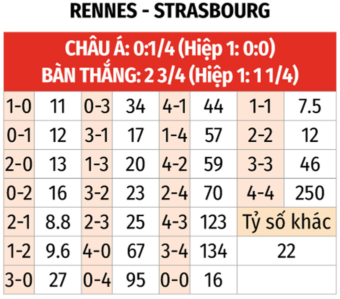 - Tối thiểu 2 bàn hiệp 1: 4/6 trận vừa qua của Strasbourg có tối thiểu 1 bàn trong hiệp 1, với 3 trận trong số đó có từ 2 bàn trở lên. Với Rennes, 3/4 trận vừa qua của đội chủ nhà thậm chí có từ 2 bàn trở lên trước giờ nghỉ. Chưa kể, 5/7 trận đối đầu gần nhất cũng kết thúc hiệp đầu tiên với ít nhất 1 bàn thắng được ghi.
