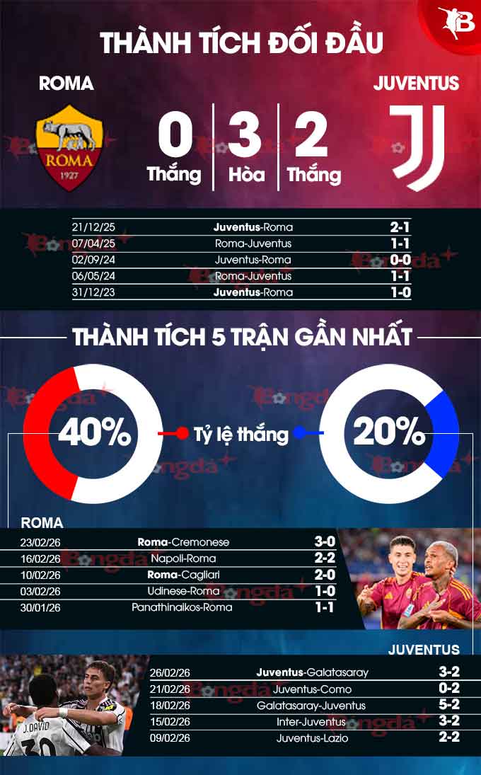 - Hai đội cùng ghi bàn: 3/4 trận đối đầu gần nhất đều khép lại với ít nhất 1 bàn thắng cho mỗi đội. Ngoài ra, Roma luôn ghi bàn ở 10/11 trận gần nhất, còn Juventus cũng làm điều tương tự ở 4/5 trận vừa qua.
