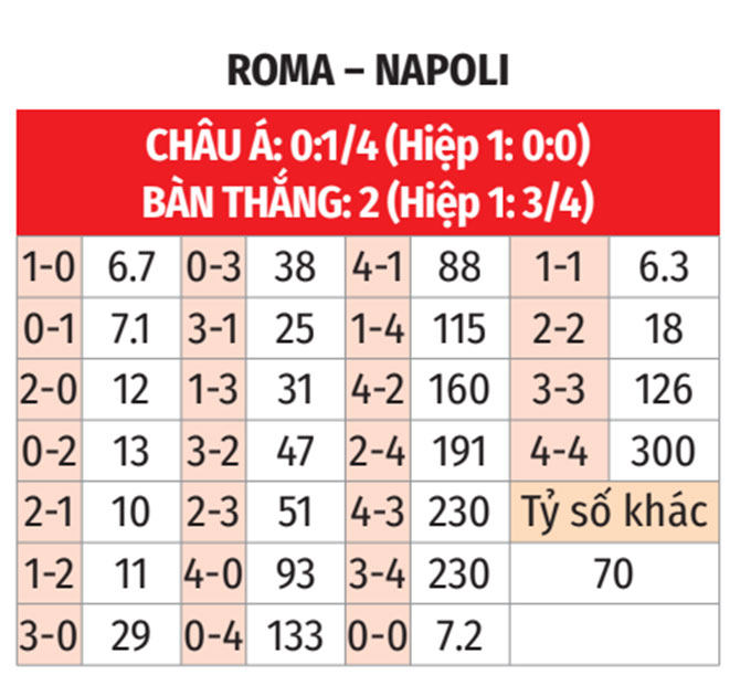 - Roma thắng hiệp 1 theo châu Á: Roma đang có chuỗi 4 trận thắng hiệp 1 liên tiếp theo châu Á. Tiếp đón Napoli thua hiệp 1 theo châu Á ở 4/6 trận vừa qua, đội chủ nhà là sự lựa chọn đáng tin cậy trước giờ nghỉ.
