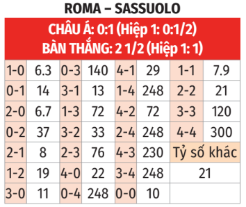 - Roma thắng theo châu Á: Trong 9 trận chính thức gần đây khi là đội trên cơ, thành tích theo châu Á của Roma là thắng 7, hòa 1 và thua 1. Sassuolo thua theo châu Á 3/4 trận vừa qua. 3 lần chạm trán gần nhất giữa đôi bên, Roma toàn thắng nếu không xét tới thành tích theo châu Á.