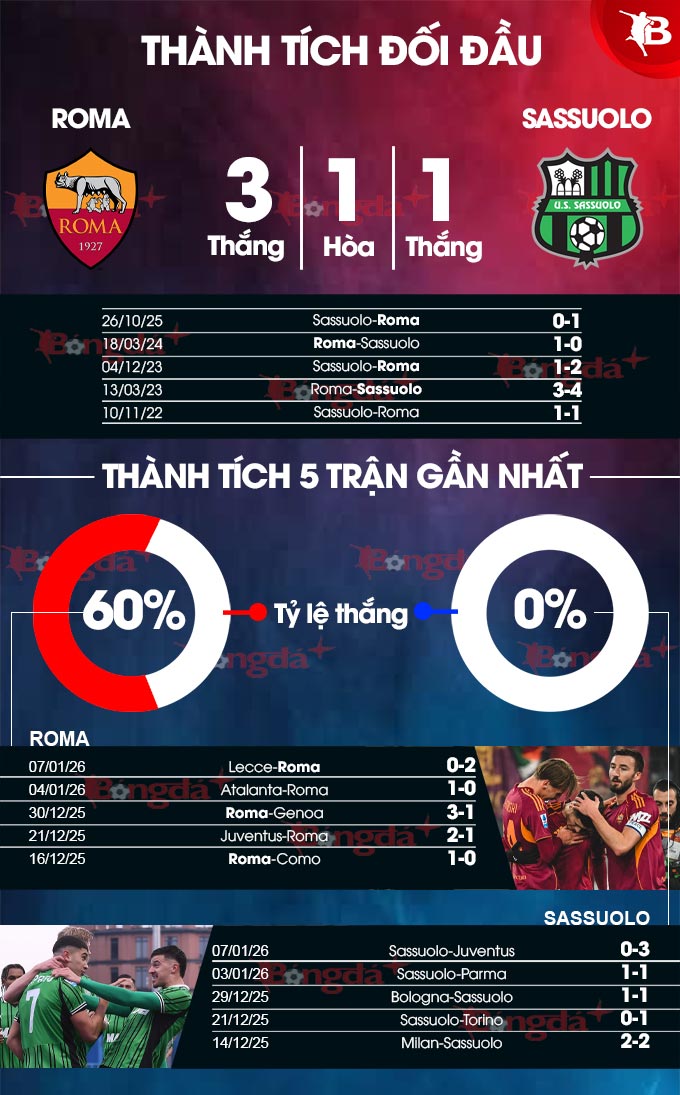 Trong 8 trận Serie A gần đây, Sassuolo chỉ thắng duy nhất 1 trận trước Fiorentina, khi ấy đang đứng chót bảng. Dù vậy nhờ thành tích được tích lũy ở giai đoạn đầu mùa, đội quân của HLV Fabio Grosso hiện đang rất thảnh thơi với 10 điểm nhiều hơn vị trí nguy hiểm. Roma đủ khả năng giành 3 điểm để tiếp tục đua Top 4.
