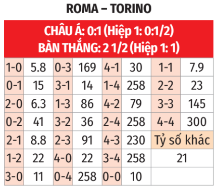 - X cả trận: 12/13 trận chính thức gần đây của Torino có tối đa 2 bàn thắng. 11/13 trận Serie A vừa qua của Roma cũng vậy, không có quá 2 lần lưới rung. 5/6 lần chạm trán gần nhất giữa đôi bên cũng về X. Roma đá thực dụng còn Torino đang khủng hoảng, trận này sẽ không có quá 2 bàn.