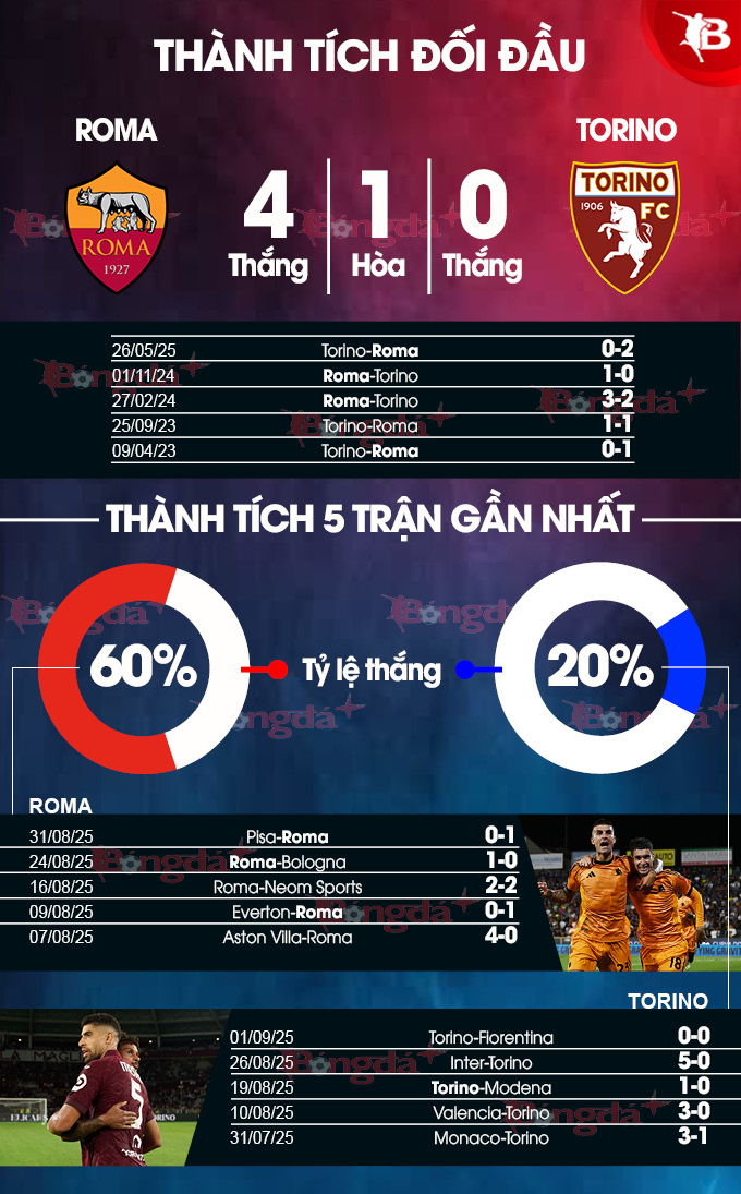 - X góc chung cuộc: Cả 4 trận Serie gần đây của Roma và 4/6 trận Serie A vừa qua của Torino đều X góc. Cả 4 lần đối đầu gần nhất giữa đôi bên cũng X góc chung cuộc. Trận này cũng sẽ X góc chung cuộc.