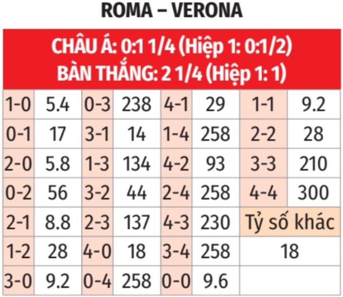 - Lẻ bàn thắng: 5 lần gặp giữa 2 đội gần đây kết thúc với tổng số bàn thắng là số lẻ. Tình trạng tương tự xảy ra ở 5 trận gần đây của Roma và 11/18 trận sân khách vừa qua của Verona ở Serie A.