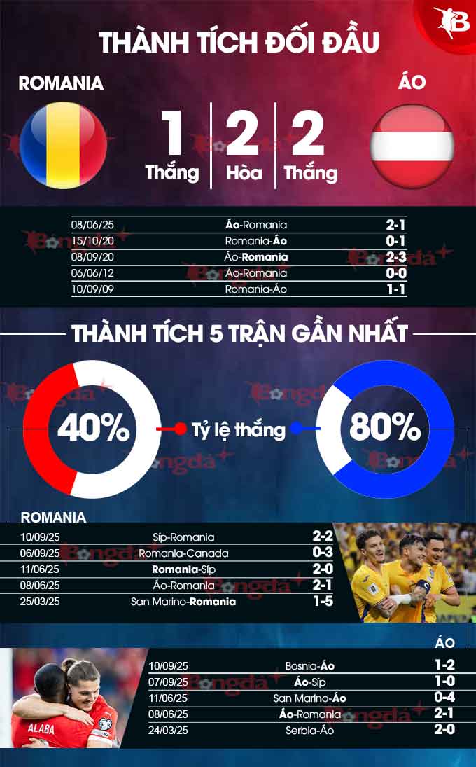 - Hai đội không cùng ghi bàn: 3/4 trận sân nhà gần nhất của Romania đều có đội "tịt ngòi". 3/4 trận gần đây của Áo cũng luôn có đội bất lực trong việc tìm đường vào khung thành đối phương.