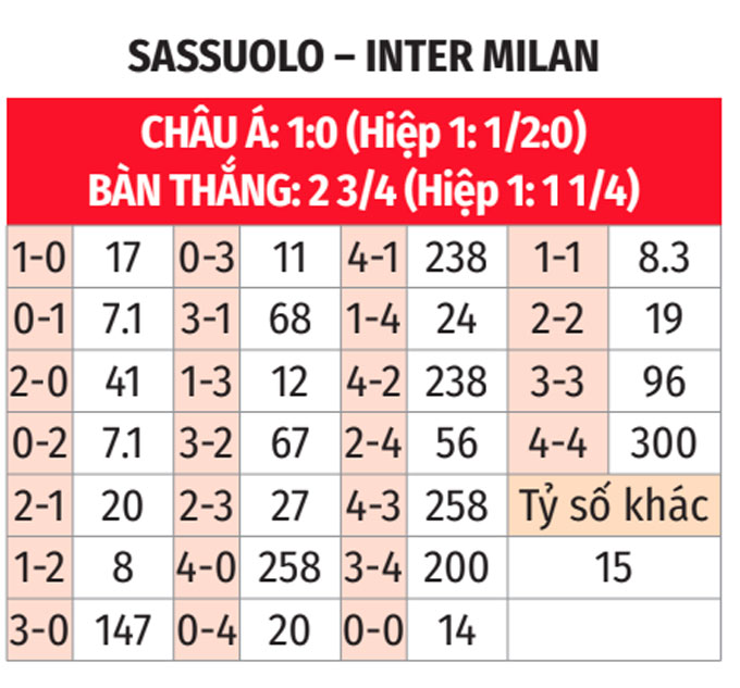 - Inter thắng hiệp 1 theo châu Á: Ở 4 trận gặp Inter gần đây, Sassuolo thua hiệp 1 theo châu Á 3 lần. Đá với Inter thắng hiệp 1 theo châu Á 3/4 trận gần nhất, đội chủ nhà không phải là sự lựa chọn đáng tin cậy.