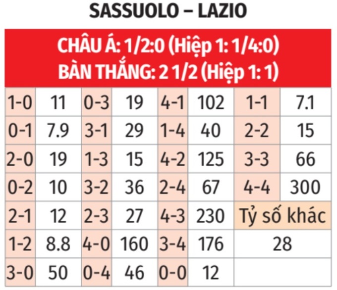 - T hiệp 1: 9/10 lần gặp nhau giữa 2 đội gần đây đều có từ 1 bàn thắng trở lên trong hiệp 1. 7/8 trận đấu gần đây của Sassuolo và 7/9 trận đấu chính thức vừa qua của Lazio đều có tối thiểu 1 bàn hiệp 1.