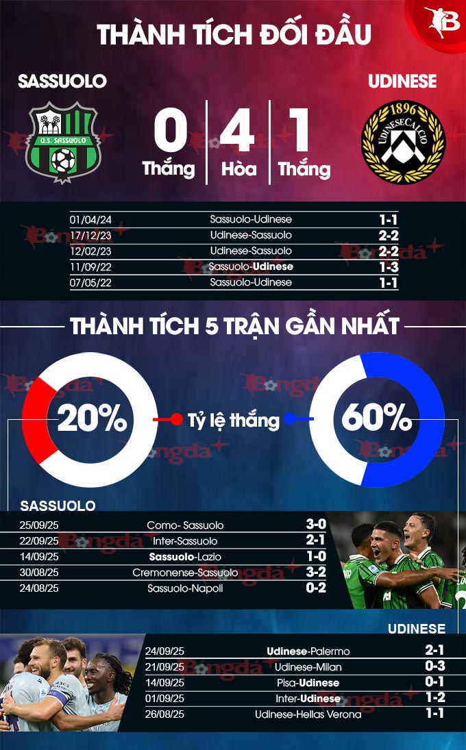 Phong độ của Sassuolo lúc này rất đáng báo động khi chỉ thắng 1/5 trận gần nhất còn Udinese thắng 3/5 trận vừa vừa xong. Trên sân nhà, Sassuolo thắng 2/3 trận chính thức gần nhất. Còn Udinese bất bại trên sân khách kể từ khi mùa giải mới khởi tranh. Chưa hết, Udinese chưa thua Sassuolo ở 10 trận gần nhất.
