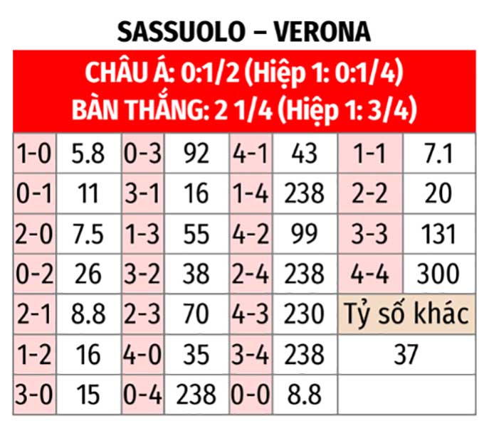 - Sassuolo thắng theo châu Á: Trong khi Sassuolo thắng theo châu Á 4/5 trận gần nhất, thì Verona lại đang có chuỗi 4 trận thua theo châu Á liên tiếp. Với xu hướng như vậy, các nhà đầu tư nên ủng hộ đội chủ nhà.