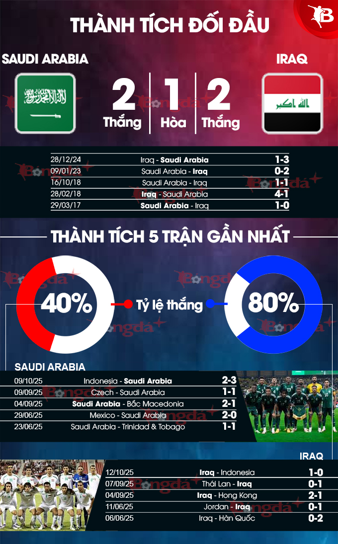 - Hai đội đều có bàn thắng: 4/5 trận gần nhất của Saudi Arabia có bàn thắng. 4/4 trận gần nhất của Iraq có bàn thắng.