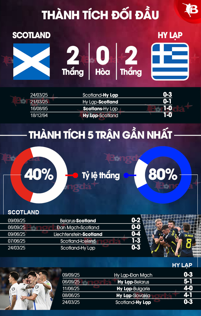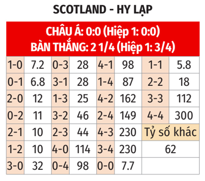 - Tối đa 2 bàn cả trận: 3/4 cuộc đối đầu giữa hai đội đều khép lại với không quá 2 bàn thắng cả trận. Ngoài ra, cả 2 trận gần đây của Scotland và 11/14 chuyến làm khách vừa qua của Hy Lạp (không tính giao hữu) đều chứng kiến tối đa 2 lần lưới rung cả trận.