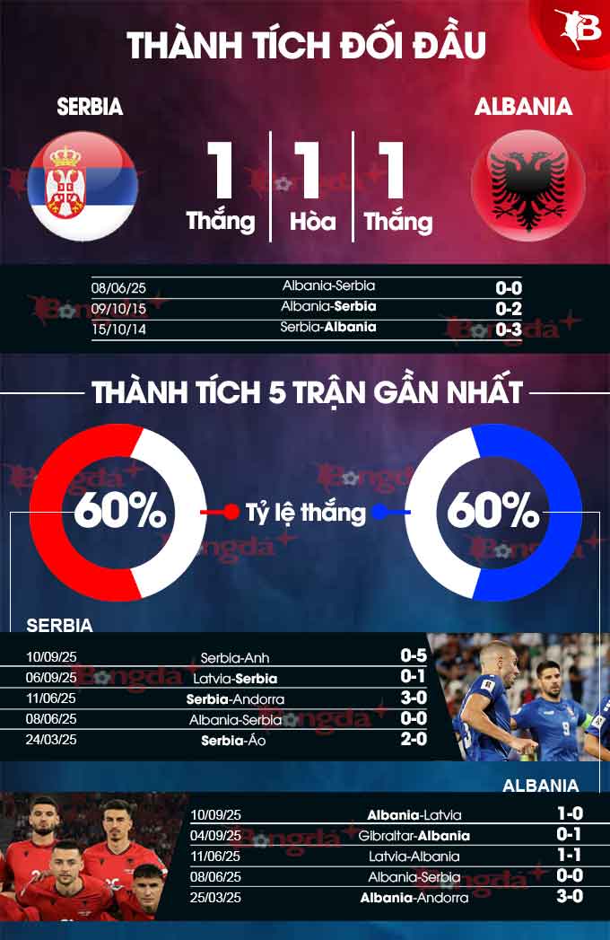 - Chẵn bàn thắng: Cả hai cuộc đụng độ gần nhất, 10/14 trận gần đây của Serbia và 5/8 trận chính thức vừa qua của Albania đều khép lại với tổng bàn thắng là chẵn. Không những thế, 6/8 trận sân nhà vừa qua của Serbia và 6/9 chuyến làm khách gần đây của Albania cũng có tổng bàn thắng chia hết cho 2.