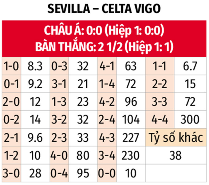 - Tối đa 1 bàn hiệp 1: 8/10 trận gần đây của Sevilla cùng 10 trận liên tiếp của Celta Vigo đều có tối đa 1 bàn thắng trong hiệp 1. 5/6 trận đối đầu gần nhất cũng có thống kê tương tự.