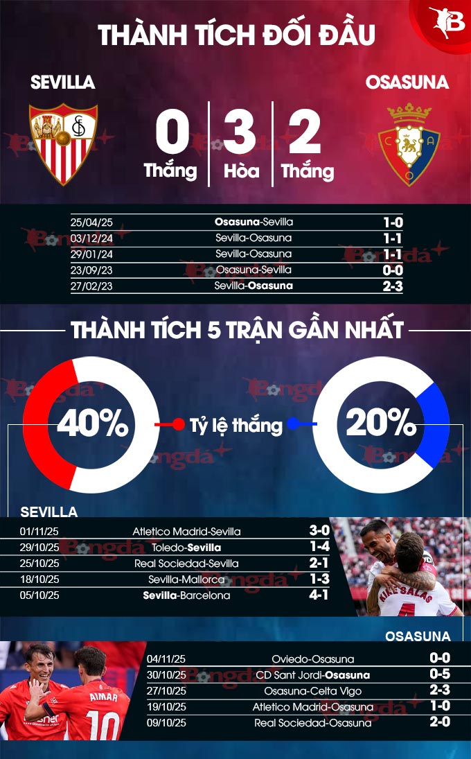 3 trong 4 trận đối đầu gần nhất giữa hai đội đã kết thúc với tỷ số hòa, trong khi chiến thắng gần nhất của Sevilla trước Osasuna diễn ra vào tháng 10/2021.