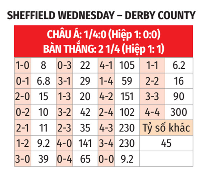 - Ít nhất 11 phạt góc: 3/4 trận gần đây của Sheffield Wednesday đều có tối thiểu 11 quả phạt góc. Điều tương tự cũng diễn ra ở 6/8 trận vừa qua của Derby County.