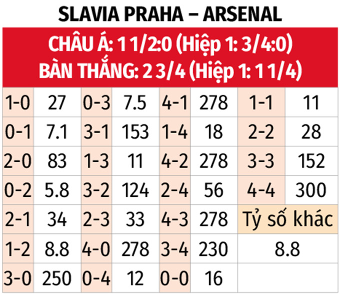 - Ít bàn thắng: Arsenal đang được xem là đội sở hữu hàng thủ mạnh nhất thế giới và họ hiện có mạch 7 trận giữ sạch lưới, nhưng bên cạnh đó hàng công lại không bùng nổ khi có 6/7 trận gần đây ghi nhiều nhất 2 bàn. Với Slavia Prague, đội chủ nhà cũng có 5 trận gần nhất không để thủng lưới, trong đó có 4 trận xuất hiện tối đa 2 bàn thắng.