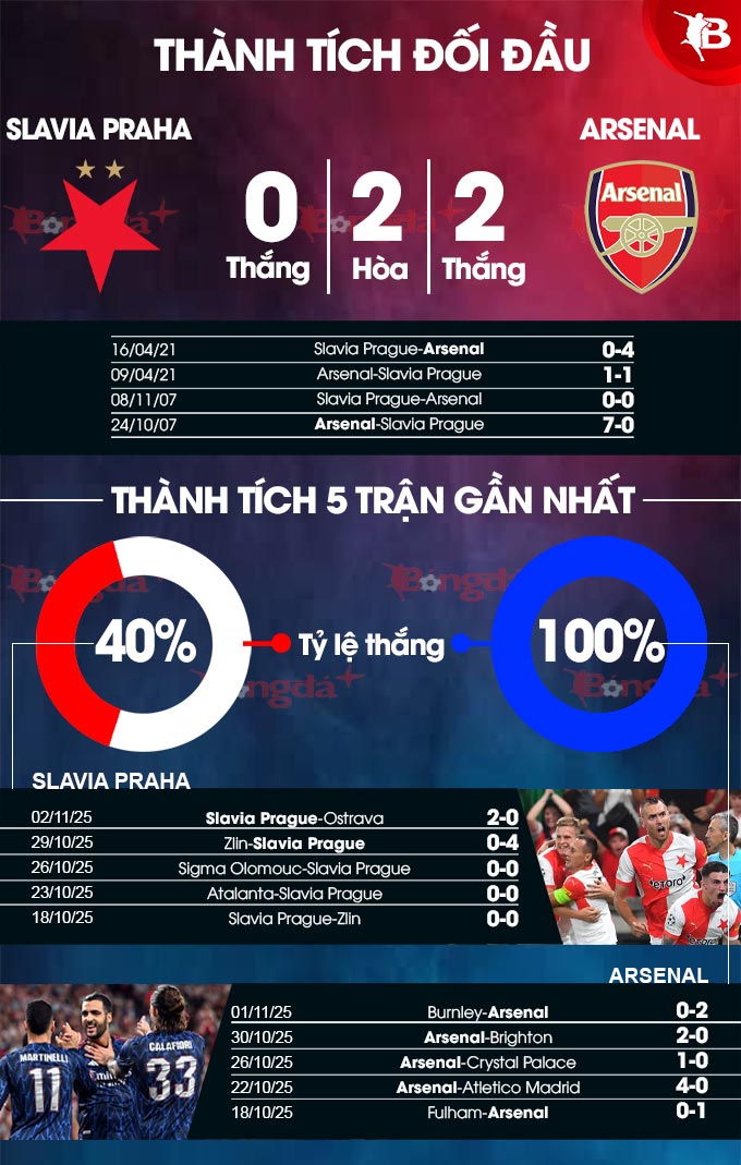 Thành tích đối đầu của Slavia Prague với đối thủ đến từ Anh cũng rất khó khăn, và trận đấu trên sân nhà gần nhất với Arsenal đã kết thúc với thất bại 0-4. Tính xa hơn, Slavia Prague hòa 2 và để thua 2 trong 4 trận gặp Pháo thủ trong quá khứ, chỉ ghi 1 bàn và để thủng lưới tới 12 bàn.