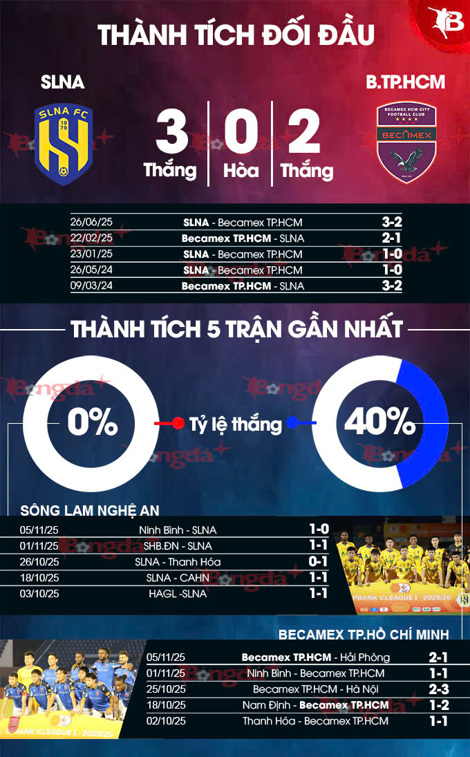 Thành tích đối đầu trên sân Vinh ủng hộ SLNA. 3 trận gần nhất được chơi tại xứ Nghệ, CLB này đều thắng sát nút Becamex TP.HCM. Đây có thể xem là điểm tựa tinh thần hiếm hoi mà SLNA trông cậy trong màn so T này. Bởi xét về phong độ và chiều sâu lực lượng, chính đại diện phía Nam mới được đánh giá cao hơn.