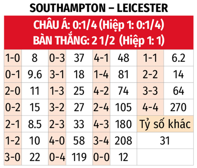 - Nhiều bàn thắng: 5/6 trận gần đây của Southampton cùng 2 trận liên tiếp vừa qua của Leicester đều có từ 3 bàn thắng trở lên. 6/8 trận đối đầu gần nhất cũng xuất hiện tối thiểu 3 pha làm bàn.