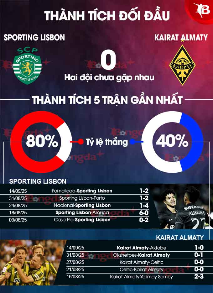 - Hai đội cùng ghi bàn: Sporting Lisbon và Kairat đã thành công trong việc ghi bàn ở 5/6 trận gần nhất. Bên cạnh đó, Sporting Lisbon cũng ghi bàn ở 4/6 trận chính thức gần nhất trên sân nhà, còn với Kairat là 4/6 trận chính thức vừa qua tại sân khách. Với xu hướng như vậy, khả năng cao hai đội sẽ cùng tìm được đường vào khung thành của nhau.