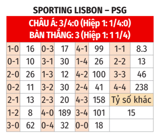 - Từ 4 bàn trở lên: 5/8 trận gần nhất của Sporting Lisbon đều có ít nhất 4 bàn cả trận. Ngoài ra, cả 4 trận sân nhà gần đây của Sporting Lisbon cũng chứng kiến tối thiểu 4 lần lưới rung cả trận. Không những thế, có tới 20 bàn thắng được ghi ở 4 trận gần nhất tại vòng phân hạng của PSG, tương đương với 5 bàn mỗi trận. Do đó, rất có thể trận này cũng sẽ chứng kiến ít nhất 4 bàn thắng cả trận.