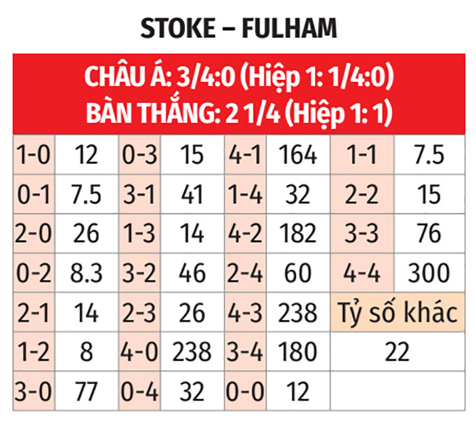 - Tỷ số lẻ: Cả 4 trận gần đây của Fulham đều kết thúc với tỷ số lẻ. 9/10 trận gần nhất giữa đội bóng này và Stoke City cũng có số bàn thắng không chia hết cho 2.