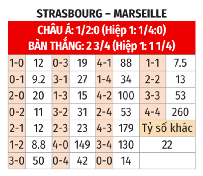 - Strasbourg thắng theo châu Á: Strasbourg thắng cả 6 cuộc đối đầu gần nhất, thắng cả 3 lần đón tiếp Marseille gần đây trên sân nhà. Ngoài ra, họ cũng thắng 8/9 trận gần đây. Còn Marseille thua 6/9 chuyến làm khách vừa qua. Vì thế, giới mộ điệu có thể tin ở Strasbourg trận này.