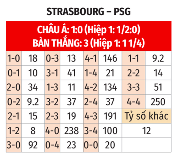 - PSG ghi bàn hiệp 1: PSG ghi ít nhất 1 bàn trong hiệp 1 ở 9/10 cuộc đối đầu gần nhất, ở 7/10 chuyến làm khách gần đây tại sân La Meinau. Hơn nữa, PSG cũng xuyên thủng lưới đối phương trong hiệp 1 ở 6/8 trận gần đây tại Ligue 1. Trận này khó có ngoại lệ.