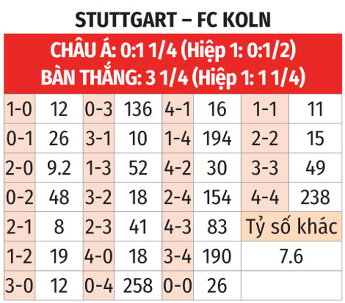 Stuttgart có lợi thế sân nhà và đang chơi tốt tại đây khi thắng 7, hòa 2 và thua 1. Chiều ngược lại, Cologne hiện chơi khá dở ở sân khách khi chỉ thắng 2/10 trận vừa xong. Chưa hết, 10 lần gặp Stuttgart, Cologne cũng chẳng có kết cục tốt khi thắng 2, thua 6 và hòa 2. Do đó, khả năng cao 3 điểm sẽ về tay Stuttgart.