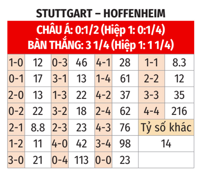 - Chẵn bàn thắng: 10/13 cuộc đối đầu gần nhất, 7/11 trận vừa qua của Stuttgart và 5/8 trận chính thức gần đây của Hoffenheim đều có tổng bàn thắng chia hết cho 2. Đặc biệt 14/16 trận đụng độ giữa hai đội tại Stuttgart cũng khép lại với tổng bàn thắng là chẵn. Trận này khó có ngoại lệ.