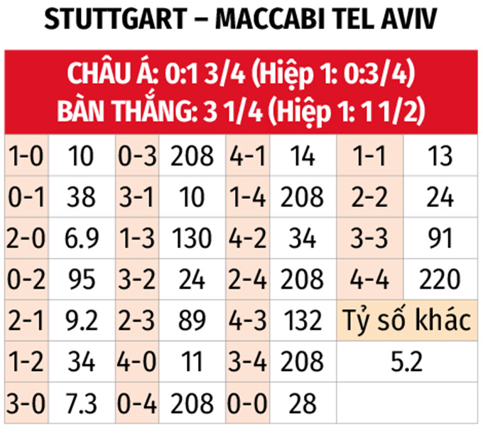 - Tối đa 3 bàn thắng: 8/10 trận sân nhà gần đây của Stuttgart đều kết thúc với nhiều nhất 3 bàn thắng được ghi. Với Maccabi Tel Aviv, các chân sút đội khách mới ghi 1 bàn tại vòng phân hạng Europa League và đang tịt ngòi 3 trận liên tiếp tại giải đấu này.