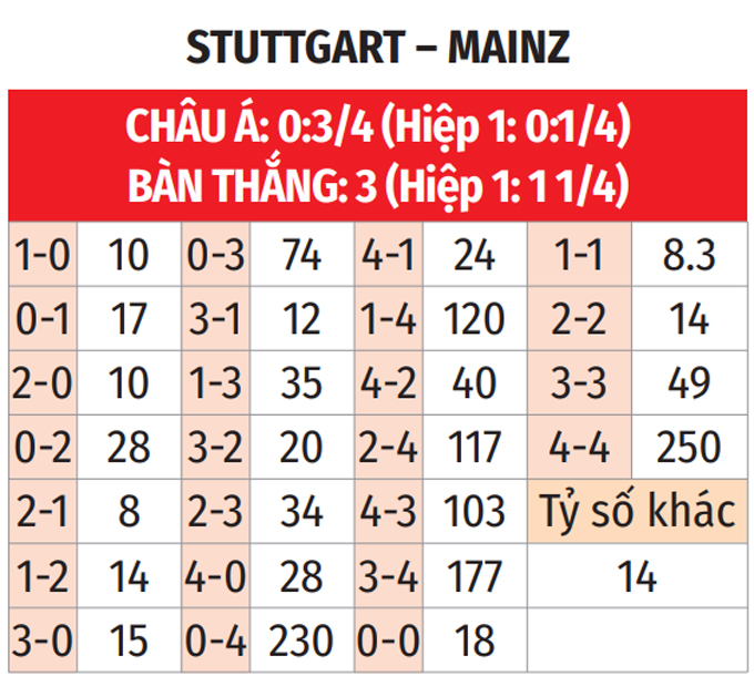 - Lẻ bàn thắng: 5/6 trận gần nhất của Stuttgart có tổng bàn thắng không chia hết cho 2. Ngoài ra, 7/10 trận vừa qua của Mainz chứng kiến điều tương tự.