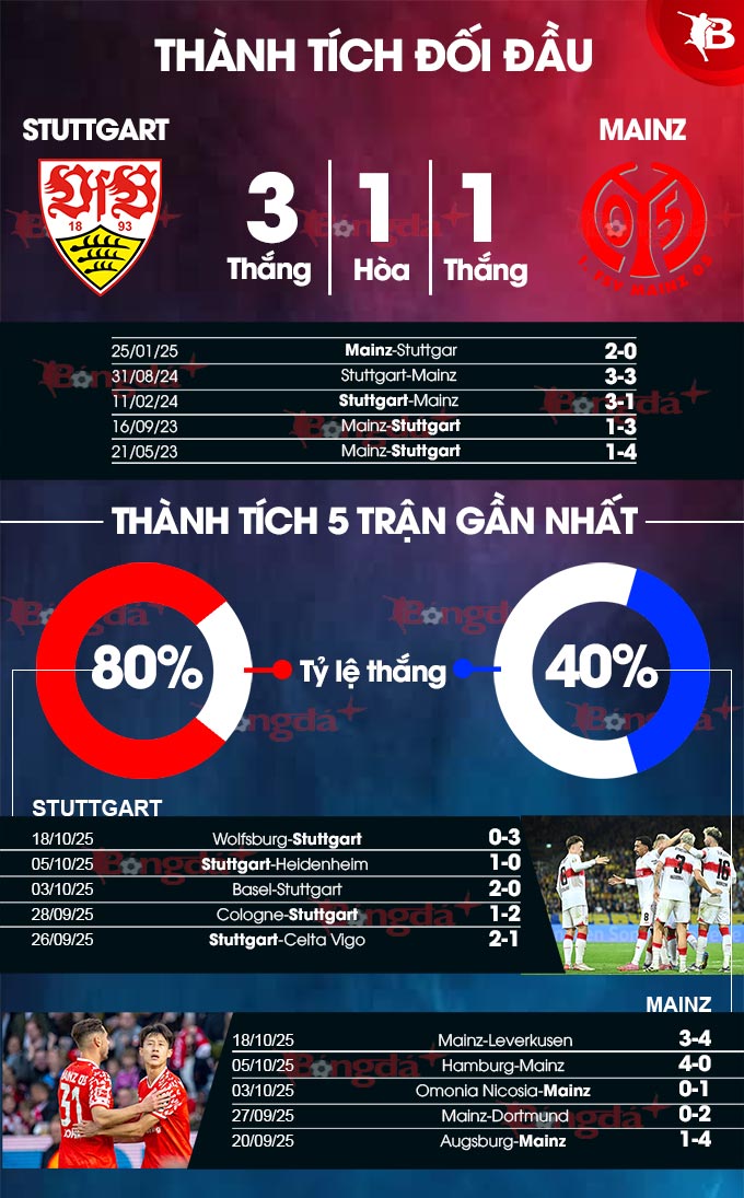 Bên cạnh đó, Stuttgart còn có thành tích đối đầu trực tiếp tốt trước Mainz khi thắng 6/10 trận vừa qua. Chưa hết, trong 5 lần gần nhất tiếp Mainz, đội chủ nhà Stuttgart đều bất bại khi thắng 3, hòa 2 . Do đó, Stuttgart nhiều khả năng sẽ có 3 điểm ở trận này.