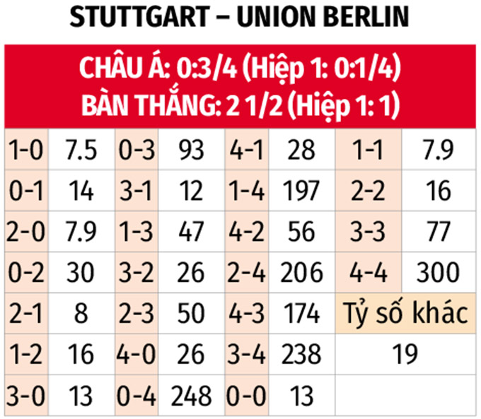 - Hai đội cùng ghi bàn: Hiệu suất tấn công của Stuttgart trong 4 trận đấu gần đây tại giải VĐQG cho thấy họ có thể kiểm soát trận đấu trên sân nhà, nhưng khả năng phòng ngự kém cỏi của họ khiến việc Union Berlin ghi bàn là hoàn toàn có thể xảy ra. Kịch bản hai đội cùng ghi bàn như 3 trận đối đầu gần nhất khả năng sẽ tái diễn.