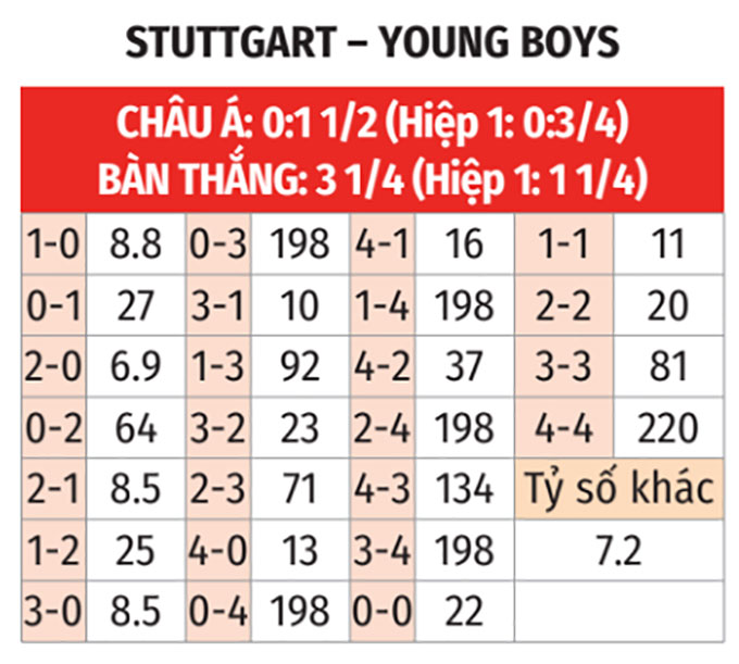 - Tỷ số chẵn: 3/4 trận gần đây của Stuttgart ở Europa League đều kết thúc với tỷ số chẵn. 3/4 trận gần nhất giữa đội bóng này và Young Boys số bàn thắng cũng chia hết được cho 2.