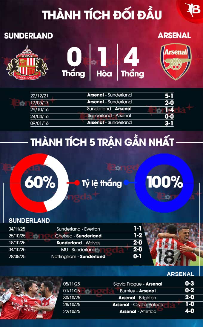 - Arsenal ghi bàn hiệp 1: Arsenal luôn xuyên thủng lưới Sunderland trong hiệp 1 ở 8/11 cuộc đối đầu gần nhất, ở 4/5 chuyến làm khách gần đây tại sân The Light. Hơn nữa, Arsenal cũng làm được điều tương tự ở 3/4 trận vừa qua, ở cả 2 chuyến xa nhà vừa qua.