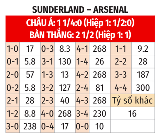 - 2 hoặc 3 bàn cả trận: 10/12 trận gần nhất của Sunderland và cả 3 trận gần đây của Arsenal đều khép lại với 2 hoặc 3 bàn cả trận. Ngoài ra, cả 7 trận sân nhà vừa qua của Sunderland và 5/6 chuyến xa nhà gần đây của Arsenal đều khép lại với 2 hoặc 3 bàn sau 90 phút.