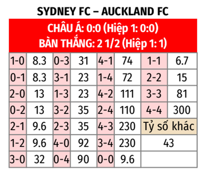 - Sydney FC thắng theo châu Á: Sydney FC thắng 5/7 trận sân nhà gần nhất; còn Auckland FC thua 5/7 trận gần đây, thua 3/4 chuyến làm khách vừa qua.