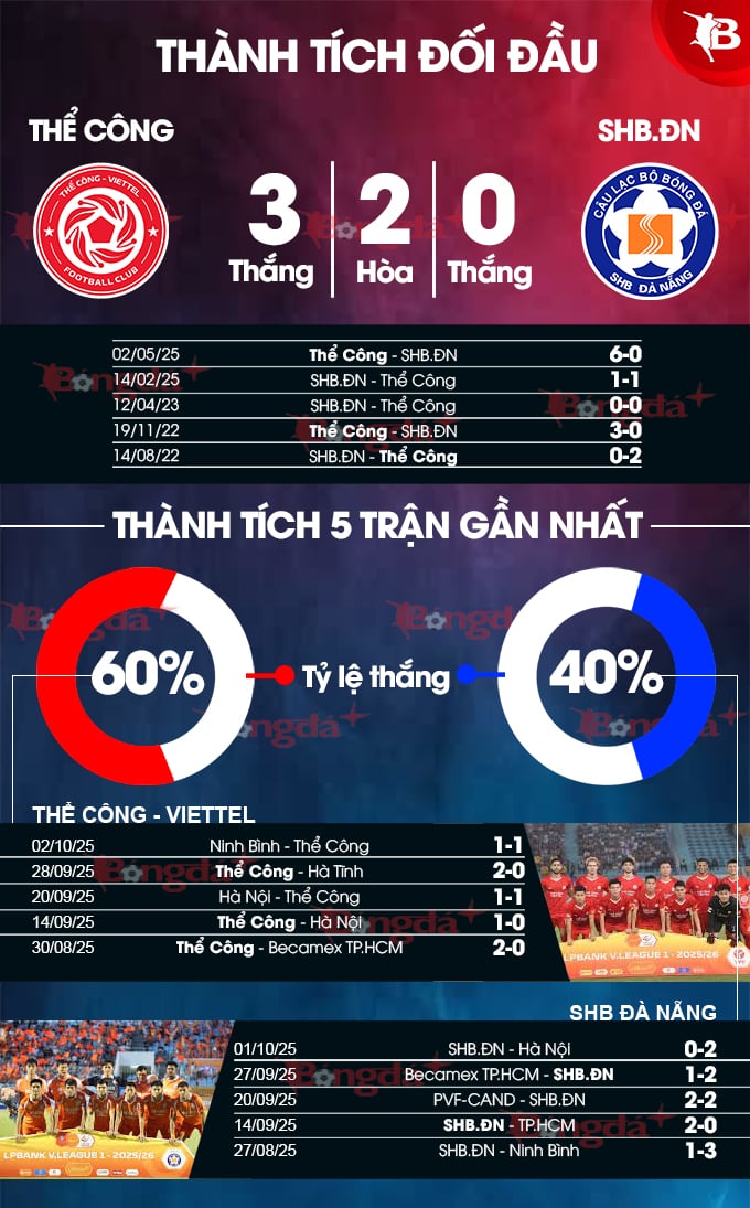 Mùa giải năm ngoái, trên sân nhà, Thể Công Viettel từng có chiến thắng “hủy diệt” với tỷ số 6-0 trước SHB.ĐN. Mùa này, đội bóng sông Hàn có nhiều sự thay đổi tích cực hơn. Tuy nhiên, xét về mọi mặt, Thể Công Viettel vẫn được đánh giá trên tầm so với SHB.ĐN. Với lợi thế sân nhà, tinh thần đang lên, đội bóng áo lính chắc chắn sẽ chủ động chơi tấn công để tìm kiếm chiến thắng thứ 4 kể từ đầu mùa.