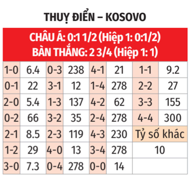 - Thụy Điển thua theo châu Á: Thụy Điển đang có chuỗi 3 trận liên tiếp theo châu Á. Tiếp đón Kosovo thắng theo châu Á 5/7 trận gần đây, đội chủ nhà không phải là sự lựa chọn an toàn.