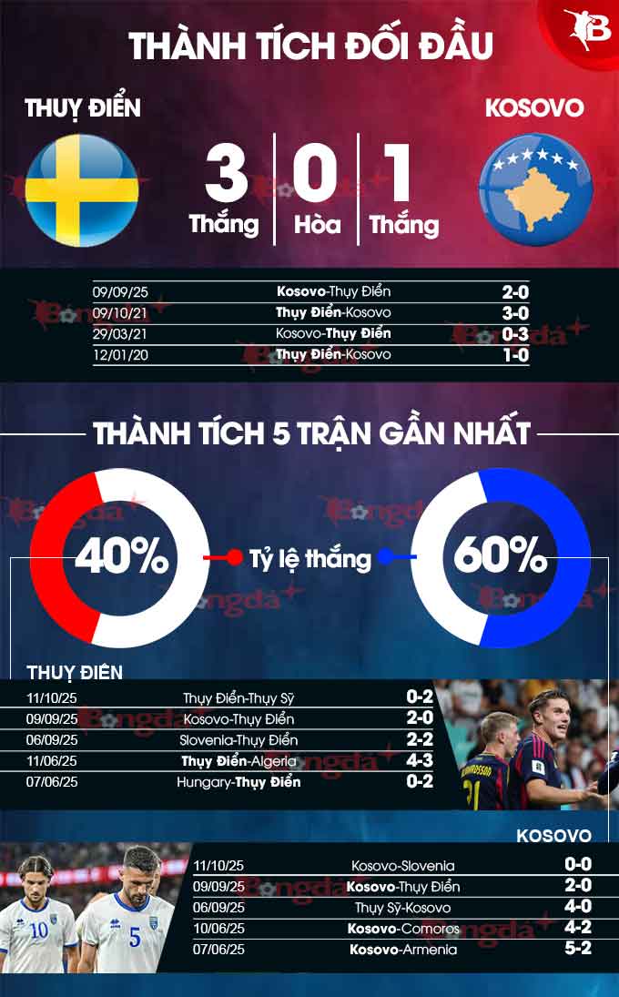 - Tối thiểu 3 bàn: 4/6 trận sân nhà gần đây của Thụy Điển chứng kiến lưới rung ít nhất 3 lần. 5/7 trận vừa qua của Kosovo số bàn thắng cũng đều trên mức 2.