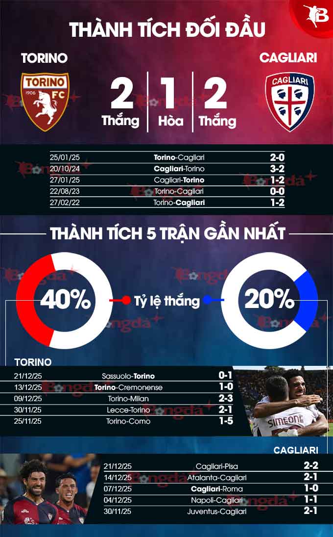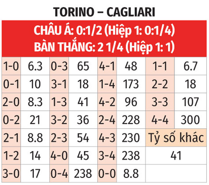 Torino có lợi thế sân nhà và có thành tích tốt gần đây khi thắng 4/7 trận vừa xong. Chiều ngược lại, Cagliari lại đang "sợ" sân khách.
