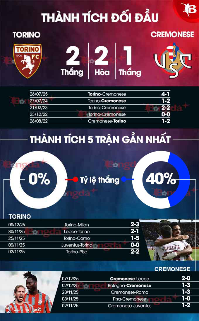 - Lưới rung cuối hiệp 2: 3/4 trận sân nhà gần đây của Torino ở Serie A có thêm bàn thắng kể từ phút 70. 4/5 trận gần nhất của Cremonese tại Serie A cũng xuất hiện bàn thắng muộn.