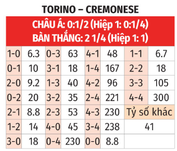 - Torino thắng theo châu Á: Torino đang kém Cremonese tới 6 điểm và 6 bậc trên BXH nên việc Torino nhường 1/2 bàn là khá sâu, nhất là xét thực tế họ có truyền thống không giỏi đàn áp các đối thủ yếu hơn. Với cách niêm yết tỷ lệ có phần vô lý như vậy, Torino sẽ giành 3 điểm.