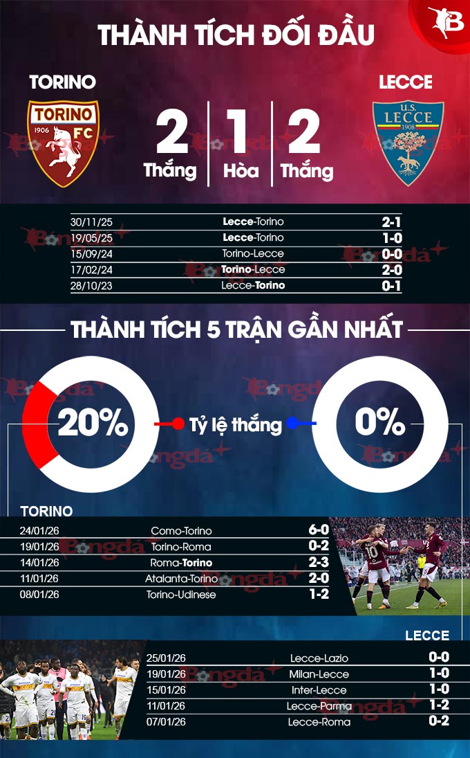 Điều may mắn cho Torino là cặp đấu này có xu hướng đãi đội mạnh hơn. Cộng thêm với tỷ lệ nhường khá sâu so với thực lực, Torino sẽ có 90 phút thăng hoa để bỏ lại Lecce ở phía sau trong cuộc đua trụ hạng.