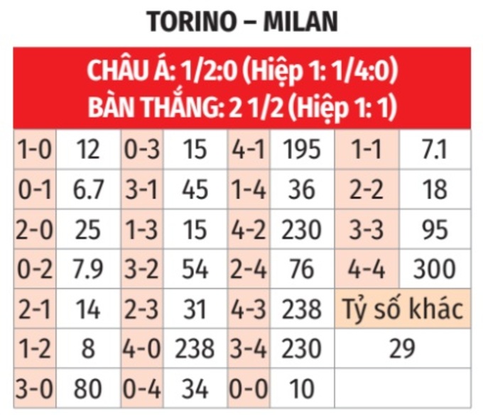 - Tối thiểu 1 bàn hiệp 1: 4 lần đối đầu giữa 2 đội gần đây đều có từ 1 bàn thắng trở lên trong hiệp 1. 9/11 trận gần đây của Torino và 4/6 trận vừa qua của Milan ở Serie A xảy ra tình trạng tương tự.
