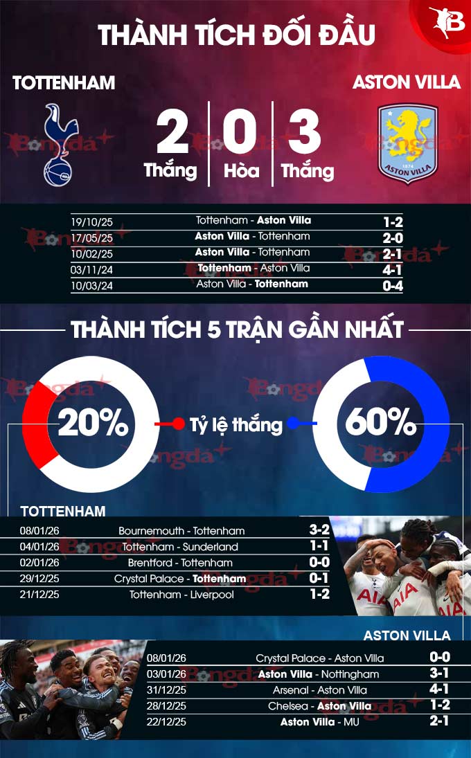 - Tối thiểu 3 bàn cả trận: 8/10 lần đối đầu giữa 2 đội gần đây kết thúc với tối thiểu 3 bàn thắng. 5/7 trận sân nhà gần đây của Tottenham và 8/9 trận mới nhất của Aston Villa xảy ra tình trạng tương tự.