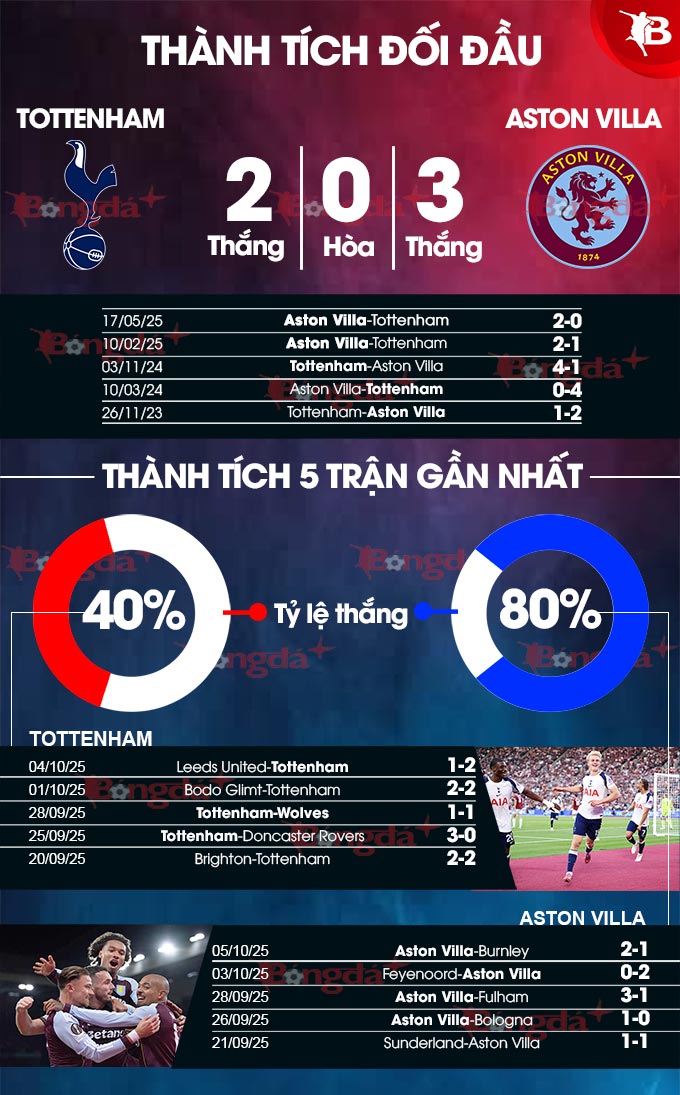 Với đà thắng như chẻ tre như vậy, Aston Villa có lý do để tự tin khi tới làm khách trên sân của Tottenham, bất chấp thực tế Gà trống là đối thủ sừng sỏ đang có phong độ tốt. Vẫn biết Tottenham đã bất bại 7 trận liên tiếp, nhưng họ lại không được lịch sử ủng hộ khi phải nhận đến 5 thất bại trong 7 trận gặp Aston Villa gần nhất.