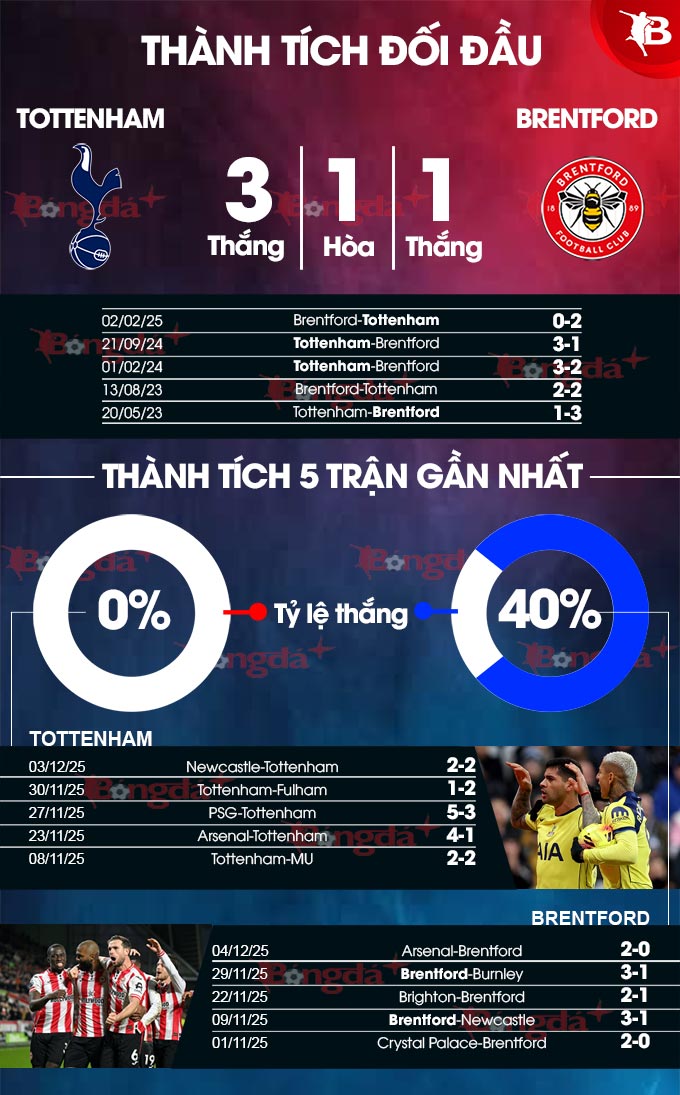 - Nhiều bàn thắng: 5/6 trận gần đây của Tottenham đều có ít nhất 4 bàn thắng được ghi. 3/4 trận vừa qua của Brentford cùng 5/6 trận đối đầu gần nhất đều kết thúc với tối thiểu 3 tình huống làm bàn.